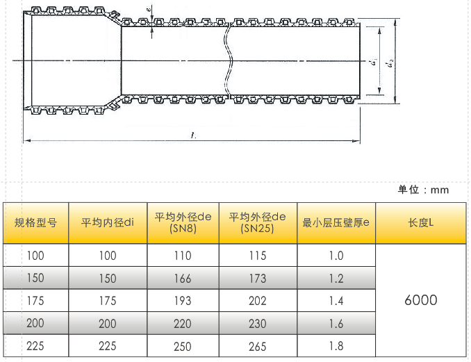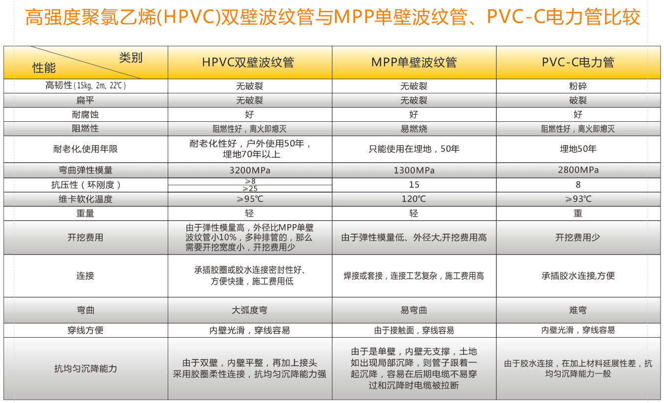 高強(qiáng)度聚氯乙烯(HPVC)雙壁波紋管內(nèi)、外壁之間呈中空環(huán)狀結(jié)構(gòu),充分利用工字鋼結(jié)構(gòu)原理,提高截面慣性矩,環(huán)鋼度高。產(chǎn)品具有強(qiáng)度高、韌性好、質(zhì)地輕等優(yōu)點(diǎn)。產(chǎn)品運(yùn)用開(kāi)挖工程,可代替MPP單壁波紋管、玻璃鋼管、PVC-C電力管、PVC-U通信管等管材。